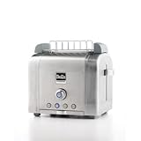 Long life filament elements, soft touch cancel, electronic controls for 2 slices on 2 sides, allows you to select one or two slots, variable browning control, cord storage, extra wide and deep slots, four settings: one slot, two slots, bagel, defrost, auto center bun warming rack allows you to reheat and toast, polished stainless steel crumb tray, heavy, die-cast aluminum, back lit controls with blue LED lights, replaceable elements, push down lever with automatic centering, auto eject. Read more